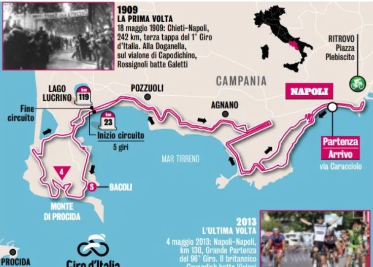 Napoli torna finalmente protagonista del Giro d’Italia. Sabato 14 maggio, l’ottava tappa del tour per la Maglia Rosa partirà dal lungomare, proseguendo la corsa sulla collina di Posillipo, fino a Fuorigrotta verso Bacoli. 4 giri pedalando fino a Monte di Procida.