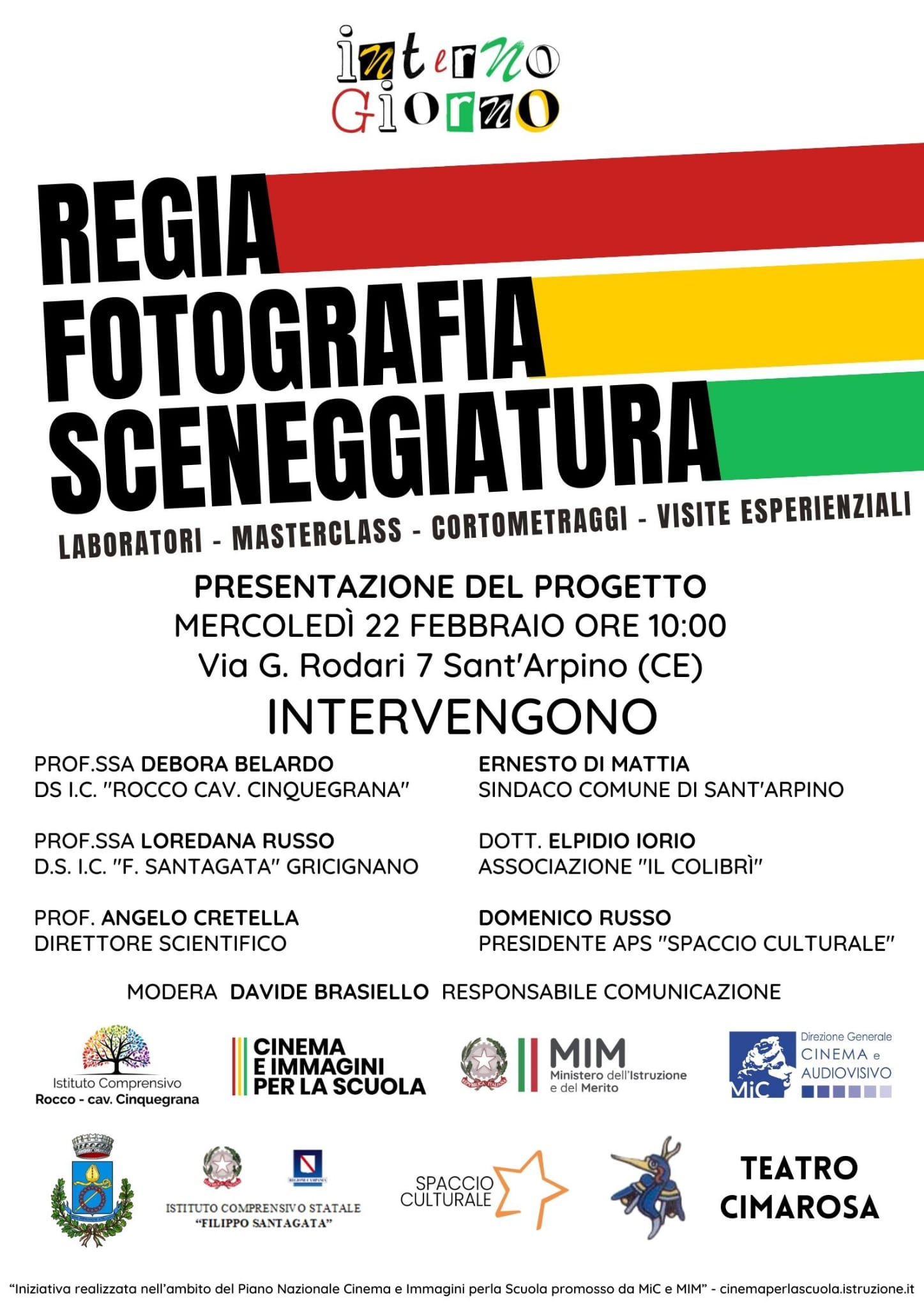 Si presenta domani mattina al plesso “V. Rocco” dell’IC “Rocco – Cav. Cinquegrana” di Sant’Arpino, in via Rodari, il progetto Interno Giorno, vincitore del Bando emanato dal MI e dal MiC nell’ambito del Piano Nazionale Cinema e Immagini per la scuola (CIPS). A supportare il percorso di educazione all’immagine rivolto a studentesse e studenti, assieme al Comune casertano di Sant’Arpino, anche altri enti, tra cui l’Associazione “Il Colibrì”, l’ente del terzo settore “Spaccio Culturale” e il cine-teatro “Cimarosa” di Aversa.