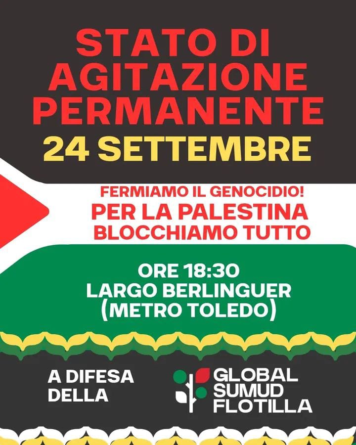“Questo è il momento di agire! È il momento di fare pressione sulle nostre istituzioni, di difendere la flotta dell’umanità, ma soprattutto di continuare a mobilitarci per fermare il genocidio”, questo l’invito alla mobilitazione fatta dalla società attiva napoletana, che si prepara a scendere in piazza ancora una volta dopo le oceaniche manifestazione di lunedì. “Il 22 abbiamo dimostrato la straordinaria forza di questo movimento di solidarietà internazionale, oggi ci vediamo alle 18:30 a Largo Berlinguer!”, concludono rilanciando.