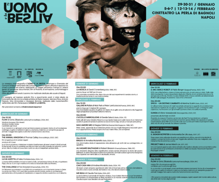 Sarà il Cineteatro La Perla di Bagnoli a Napoli a ospitare, da mercoledì 29 gennaio, ‘L’uomo e la bestia’, rassegna cinematografica ideata da Antonietta De Lillo con la curatela artistica di Gina Annunziata, Giuseppe Borrone, Paola Cassano, Veronica Flora, Antonio Pezzuto, realizzata dalla Marechiaro Film nell’ambito del ‘film partecipato’. L’iniziativa, promossa e finanziata dal Comune nell’ambito del progetto Cohousing Cinema Napoli con il patrocinio dell’Università Federico II e la collaborazione di Film Commission Regione Campania e Accademia di Belle Arti, affronta il rapporto fra umani e animali nel cinema. La rassegna sarà un’occasione, annunciano gli organizzatori in una nota, “di riflessione collettiva su questioni cruciali della nostra società, legate alla dimensione esistenziale, sociale e politica dell’essere umano e dalle sue profonde contraddizioni, sul suo rapporto con il nostro pianeta e i nostri coinquilini”. “Con L’uomo e la bestia – dice Ferdinando Tozzi, consigliere del sindaco per l’industria musicale e l’audiovisivo – riparte la programmazione nel settore dell’audiovisivo realizzata grazie al primo bando pubblico per il cinema del Comune. Un cartellone di 18 progetti, inaugurato nel 2024, che per l’anno in corso prevede 7 appuntamenti tra rassegne, festival e arene estive. In coerenza con il progetto Cohousing Cinema Napoli, che promuove la cultura del cinema e dell’audiovisivo nelle sue diverse forme, L’uomo e la bestia affianca generi e linguaggi differenti per proporre un viaggio cinematografico attorno a un nucleo tematico forte, quella della relazione tra l’essere umano e l’animale”. I diciassette titoli programmati in tre settimane, ogni mercoledì, giovedì e venerdì (29, 30, 31 gennaio, 5,6,7 e 12,13,14 febbraio), con matinée per i ragazzi e proiezioni serali, accompagneranno lo spettatore in un viaggio attraverso il tempo e i diversi generi di narrazione: documentari, film di finzione, animazione, cortometraggi e classici del passato. Le proiezioni saranno introdotte da rappresentanti del mondo della cultura, del cinema e dell’attivismo a tutela dei diritti degli animali dando vita, partendo dalla visione cinematografica, a un momento di scambio e ascolto reciproco sul rapporto tra esseri umani e animali. “Fin dall’inizio della mia carriera – così Antonietta De Lillo – mi sono sempre sentita spettatrice prima che regista, e anche in questa avventura, per me totalmente inedita, io e i curatori abbiamo fatto delle scelte immaginando noi stessi tra il pubblico in platea, curiosi di vedere i film proposti. Infatti abbiamo costruito un programma che non distingue fra cortometraggi indipendenti, film hollywoodiani e documentari. Per me non esistono registi esclusivamente di documentari, di finzione o di animazione: esistono storie che meritano di essere raccontate, ed è proprio seguendo questo principio che abbiamo costruito il programma della rassegna”. Attraverso la visione cinematografica di opere italiane e internazionali, che pongono gli animali davanti alla macchina da presa, la rassegna vuole restituire al pubblico di ogni età i frutti dell’indagine artistica, culturale e sociale condotta nell’ambito della pluriennale ricerca della Marechiaro Film sul tema L’uomo e la bestia. La rassegna dedica in particolare ai ragazzi delle scuole un momento per scoprire non solo il gioco di rispecchiamento che il cinema riesce a creare tra mondo animale e mondo umano, ma anche mettere in evidenza le diverse tecniche che si possono utilizzare nell’animazione. “Invitiamo tutte le scuole – afferma Maura Striano, assessora all’Istruzione e alle Famiglie del Comune – a partecipare attivamente alla rassegna cinematografica, che non solo celebra il cinema come forma d’arte, ma promuove anche valori fondamentali come il rispetto e la convivenza armoniosa con tutte le creature del nostro pianeta. Crediamo fermamente che l’educazione debba andare oltre le mura scolastiche e che esperienze come questa possano arricchire il percorso formativo dei nostri ragazzi, stimolando la loro curiosità e sensibilità verso il mondo che li circonda”.