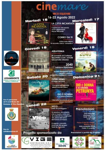 Il cinema sulla spiaggia riapre da martedì 16 agosto alla marina di Vico. Per sette sere la magia del cinema visto dai lettini e sotto le stelle ricomincia per il terzo anno. Legambiente Vico, Circolo “il Melograno” A.P.S. Penisola Sorrentina, e il Comune di Vico Equense, accendono le luci sui capolavori del cinema introdotti da incontri culturali con attori, esperti e critici.