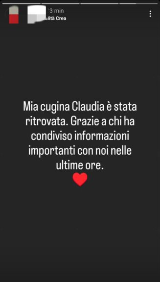 “Mia cugina Claudia è stata ritrovata“, comunica anche via social Federico, che da ieri si era messo in contatto fornendo anche il suo numero di cellulare per eventuali segnalazioni. “Grazie a chi ha condiviso informazioni importanti con noi nelle ultime ore“, le sue parole affidate alla rete che, solidale, ha risposto all’appello suo e dei suoi parenti permettendogli di rintracciare sua cugina.