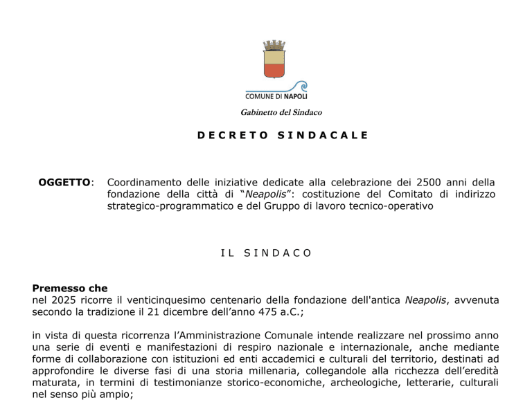 Sono stati costituiti, con Decreto del sindaco Gaetano Manfredi, il Comitato di indirizzo strategico-programmatico e il Gruppo di lavoro tecnico-operativo per il coordinamento delle iniziative dedicate alla celebrazione dei 2500 anni della fondazione della città di ‘Neapolis’.