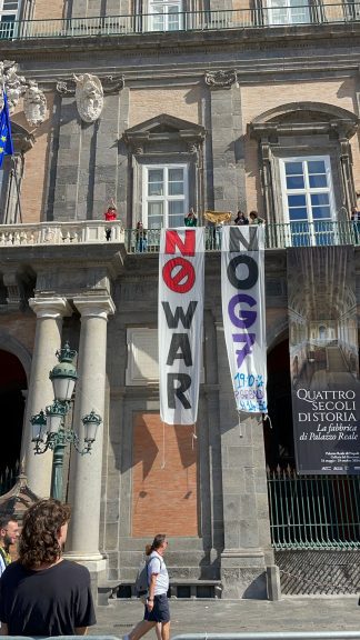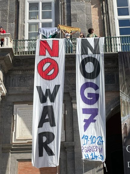 Hanno occupato simbolicamente il Palazzo Reale di Napoli, le attiviste e gli attivisti che protestano contro il summit dei ministri della Difesa in programma in città. Occupato Palazzo Reale, attiviste e attivisti hanno rilanciato la manifestazione che partirà il 19 ottobre alle 15.00 da piazza Garibaldi stendendo dai balconi del palazzo monumentale in piazza del Plebiscito alcuni striscioni e imbracciando delle kefiah, simbolo della resistenza palestinese.