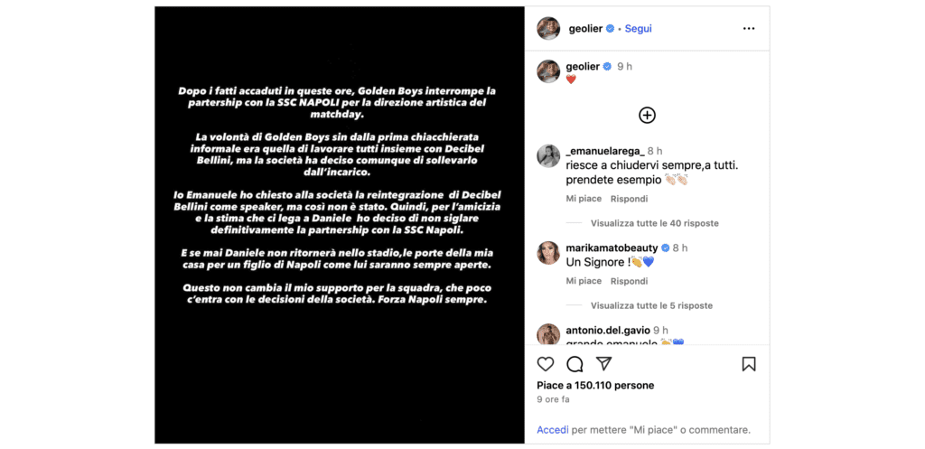 “Dopo i fatti accaduti in queste ore, Golden Boys interrompe la partnership con la SSC NAPOLI per la direzione artistica del matchday”. Così inizia il messaggio pubblicato dal rapper di Secondigliano. “La volontà di Golden Boys sin dalla prima chiacchierata informale era quella di lavorare tutti insieme con Decibel Bellini, ma la società ha deciso comunque di sollevarlo dall’incarico. Io Emanuele ho chiesto alla società la reintegrazione di Decibel Bellini come speaker, ma così non è stato. Quindi, per l’amicizia e la stima che ci lega a Daniele ho deciso di non siglare definitivamente la partnership con la SSC Napoli. E se mai Daniele non ritornerà nello stadio, le porte della mia casa per un figlio di Napoli come lui saranno sempre aperte. Questo non cambia il mio supporto per la squadra, che poco c’entra con le decisioni della società. Forza Napoli sempre”.