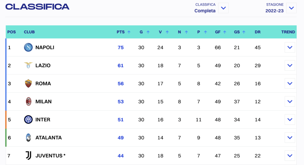 Con la “restituzione” dei 15 punti tolti alla Juve, la vetta della classifica della Serie A cambia. Ai primi posti restano fissi Napoli e Lazio, con 75 e 61 punti. I bianconeri, però, scavalcano Roma, Milan, Inter e Atalanta, volando al terzo posto con 59 punti.