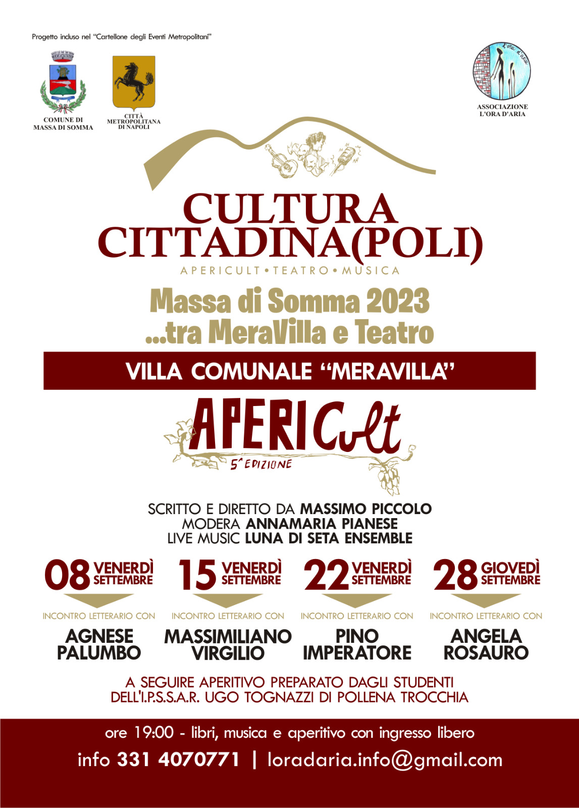 Il prossimo appuntamento nel Parco Comunale “Meravilla” a Massa di Somma con il Festival Letterario “Apericult… la cultura si fa in strada”, giunto alla 5°