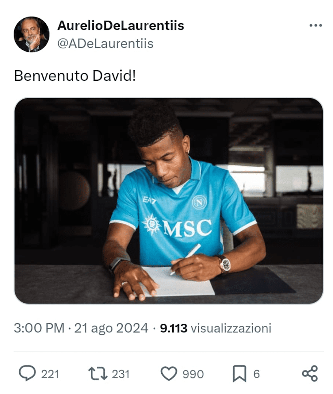Qualche giorno di attesa, ma adesso David Neres è ufficialmente un calciatore del Napoli. Ad annunciarlo su X il presidente Aurelio De Laurentiis. Dopo aver