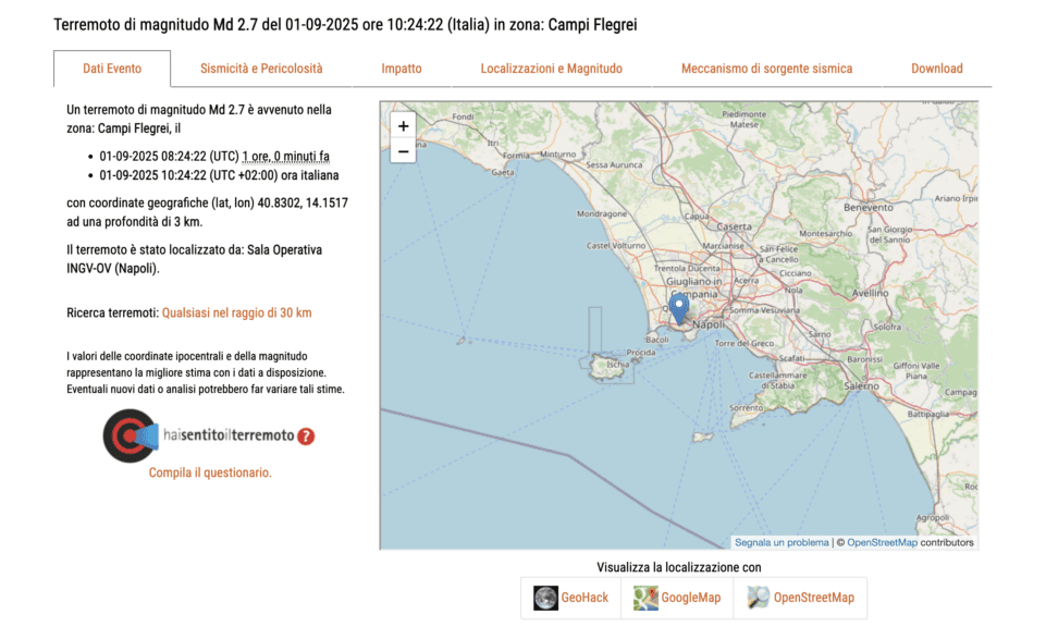 Un’altra scossa di terremoto è stata avvertita distintamente dai partenopei questa mattina, intorno alle 10:27. I dati, raccolti e rivisti dagli esperti dell’Osservatorio Vesuviani INGV, sono stati poi diffusi sul sito ufficiale dell’Istituto: magnitudo di 2.7 con epicentro localizzato nei pressi di via Pisciarelli, ad una profondità di circa tre chilometri. Anche questa scossa, come quella di stamane di 4.0 gradi di magnitudo, ha destato un discreto spavento nella popolazione. Al momento, però, mentre continuano i sopralluoghi dopo il terremoto di stamane, non sembrerebbero essere stati segnalati danni.