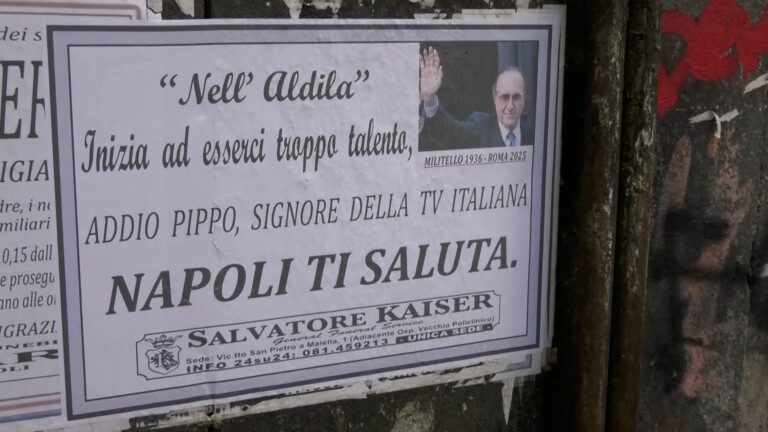 L’Italia intera saluta Pippo Baudo, icona della televisione: anche Napoli lo omaggia con un ricordo speciale. Per le strade del capoluogo campano è apparso un manifesto funebre molto particolare, firmato da una nota agenzia. Il messaggio, incisivo e commosso, recita: