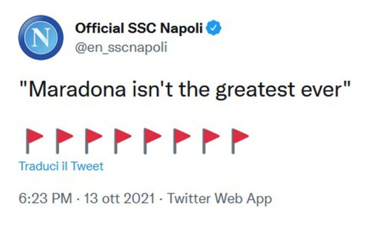 L’account del Napoli sta partecipando a una nuova ‘tweet challenge’: la regola è scrivere qualcosa di assolutamente falso e accompagnarlo a delle bandierine rosse. Molti i club che stanno partecipando e che rischiano di far infuriare i propri tifosi. «Benzema non è il miglior numero 9 al mondo» ha scritto su Twitter il Real Madrid. Il Manchester United ha risposto con «Cristiano Ronaldo non è il goat». In Serie A, oltre al Napol,i è arrivato il post del Torino: «Non siamo la miglior cosa di Torino», la Roma ha invece twittato: «Amiamo la sosta per le Nazionali». Solo un accattivante gioco social quindi, per il Napoli Maradona resta il più grande di tutti i tempi.