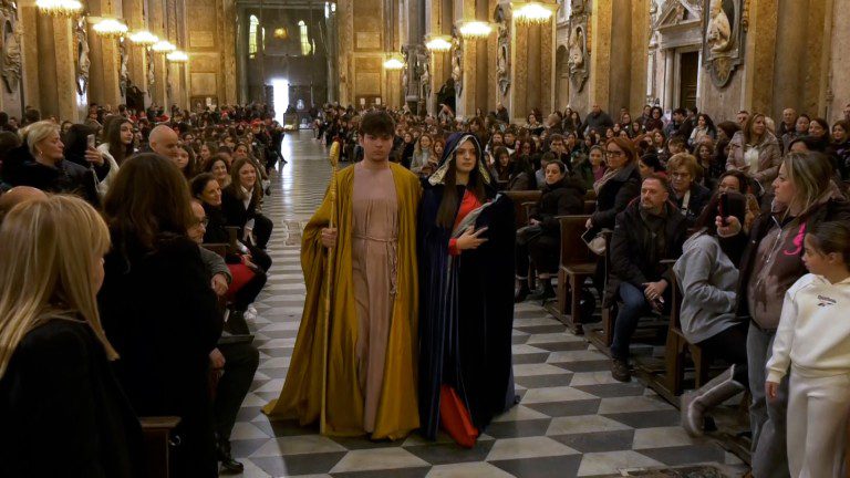 Presepe vivente in abiti storici al Duomo di Napoli. Circa 100 i costumi indossati dagli alunni dell’Istituto Statale d’Istruzione Superiore “Isabella d’Este Caracciolo” di via Savarese a Napoli.