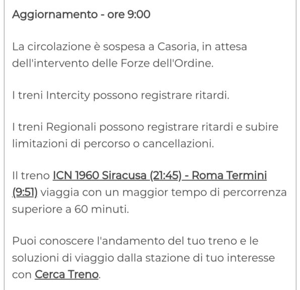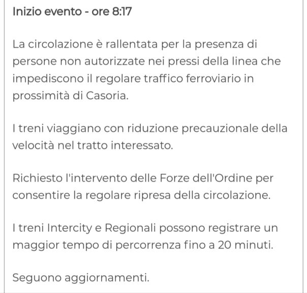 Stando a quanto si apprende da Trenitalia, sull’ultimo tratto di binari delle linee che collegano Caserta e Aversa, ma sfruttato anche dai treni che arrivano e che sono diretti a Roma, ci sarebbe una persona non autorizzata. La presenza di questo individuo, segnalata anche già sul sito delle Ferrovie dello Stato a partire dalle 8.17, ha immediatamente provocato forti rallentamenti sulla tratta, salvo poi causarne lo stop completo. Le forze dell’ordine, intervenute sul posto, starebbero lavorando per risolvere il problema. Intanto, però, dalle banchine continuano a risuonare annunci che comunicano nuove cancellazioni e ritardi.